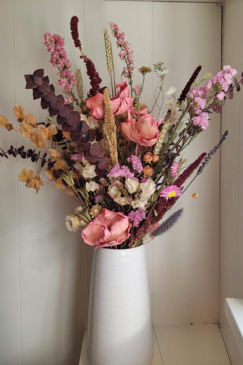 Met veel enthousiasme en creativiteit creëer ik diverse decoraties met droogbloemen. Elk van deze unieke kunstwerken is stijlvol en voegt een warme sfeer toe aan je interieur.