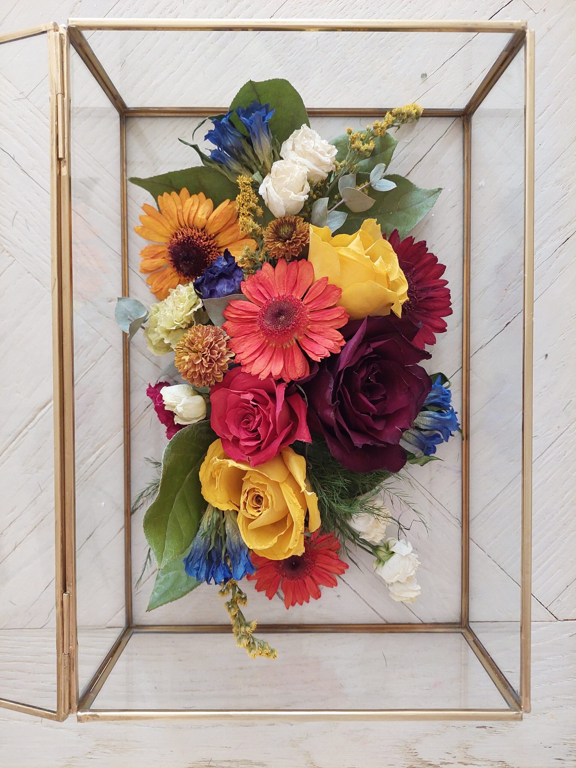 Het bewaren van bloemen vraagt om vakmanschap en véél aandacht. Het bloemstuk/boeket wordt zorgvuldig uit elkaar gehaald, elke bloem met zorg en respect behandeld en uiteindelijk in overleg geplaatst in de gewenste vitrinebox of lijst, passend bij de sfeer en betekenis van de gelegenheid waar de bloemen waren.